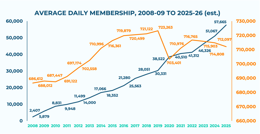 Looking at data collected by the state, we can be precise about that shift. Since the 2019-20 school year, public Charter enrollment has grown by over 27,000 students while Average Daily Membership for traditional public schools has decreased over 11,000. That represents a 90% growth for public Charters and a 2% decline for traditional public schools.