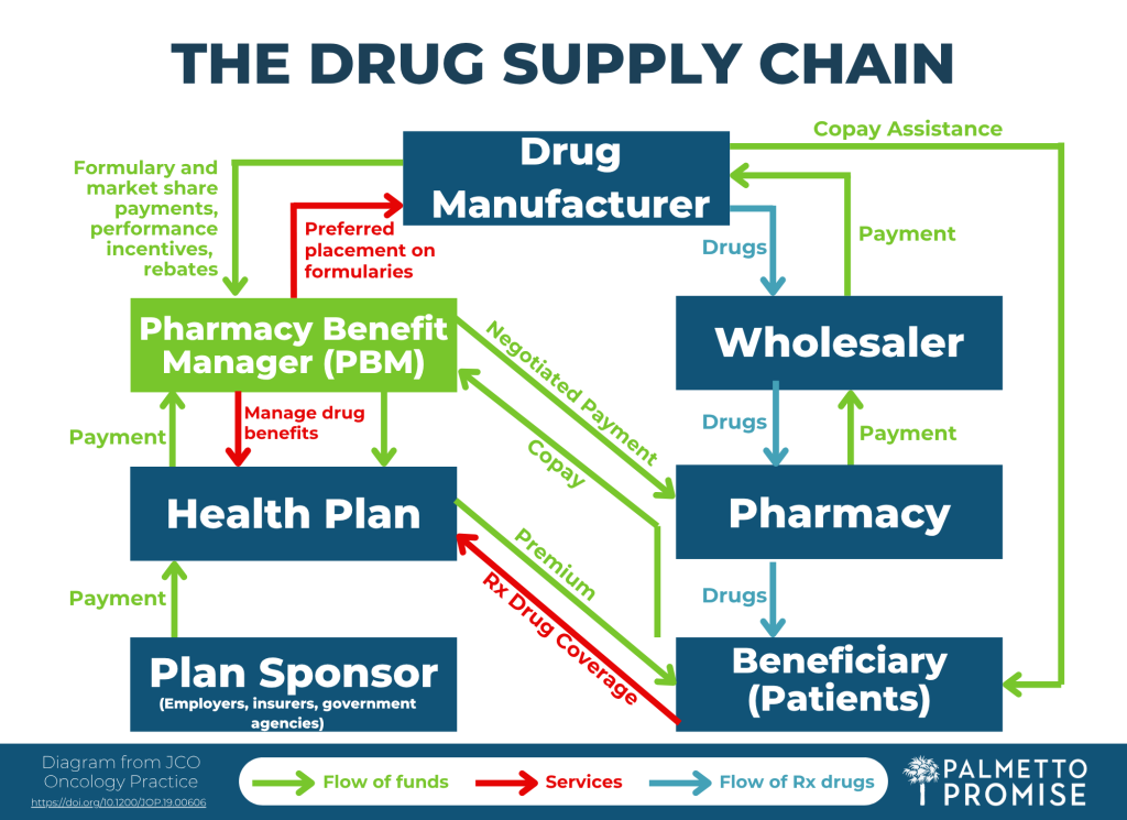 The accompanying diagram, adapted from JCO Oncology Practice and a video explanation supported by AHealthcareZ, offers descriptions of the entire drug supply chain, including the role of the PBM.