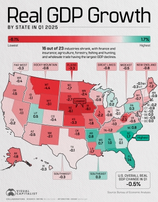 Real GDP measures the value of the goods and services produced in a place (in this instance, in each state), adjusted for inflation. The chart above measures the percentage change in GDP from the 2024 Q4 GDP statistics. Economists use Real GDP as a measure of a particular economy’s health and a rough estimate of total spending in an economy. It is a valuable way to compare economies, particularly over time.